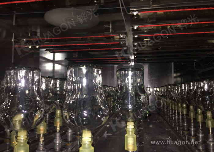 洗瓶:上料-光檢-自動清洗一(清潔劑)-自動清洗二(清水)-風刀除水-熱風除水-烘烤-轉在線料